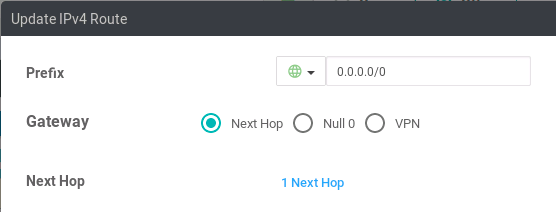 New IPv4 Route button. Set the Prefix variable to global 0.0.0.0/0.