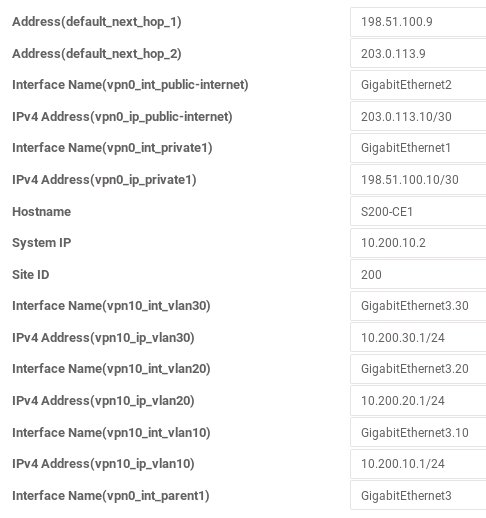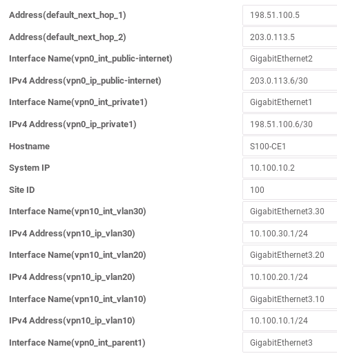 There is a tradeoff between the number of templates and the amount of information that must be entered through variables. To help guide that decision, look at what is common and what is different in what you are trying to do. In this topology, all of the links are common in that they are full-duplex gigabit Ethernet with static IP addressing. Differences include interface names, whether or not they will carry 802.1Q-tagged traffic, and whether they will belong to the transport VPN or a service VPN.
