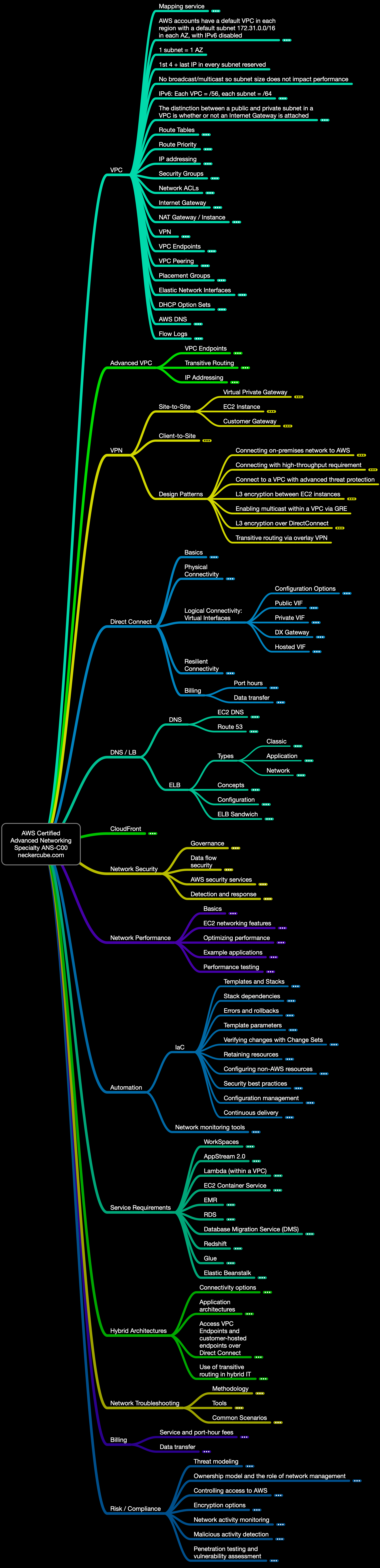 This post details the materials and methods I used to study for and pass the AWS Certified Advanced Networking Speciality ANS-C00 exam, and how you can save some money on the cost of the exam. I also include a mind map and flash cards I created while studying. The exam requires a lot of reading, with essentially 65 mini-scenarios to work through, so be prepared to take your time and pay close attention to detail!